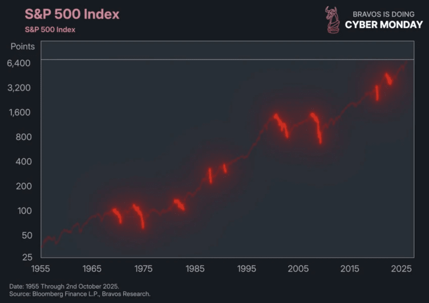 The key conclusion of Bravos Research is that all major bear markets over the past 70 years occurred under inflation conditions above 3.5%. In several cases, including 1987, 1999, and 2022, it was the rise in inflation that became the point of ending years of stock growth.