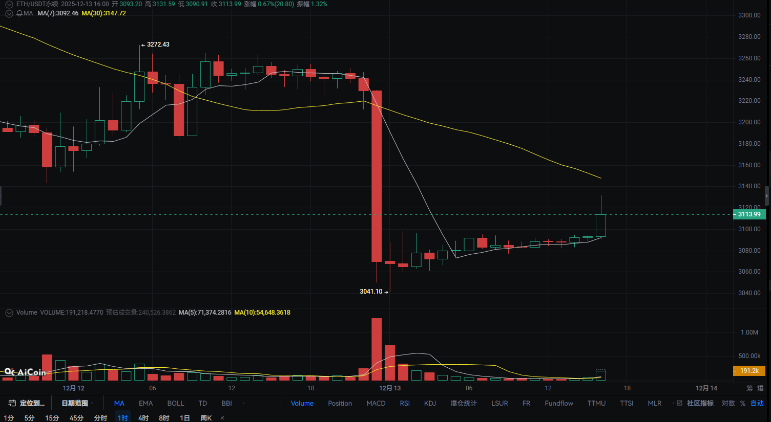 Brothers, take a look at this ETH one-hour chart; it's intense, a classic rollercoaster market. On December 13th, that sharp drop went straight from around 3270 dollars down to 3040; that sensation is something else, and I estimate another batch of leveraged brothers has been taken out. Now at this position, it's quite interesting.