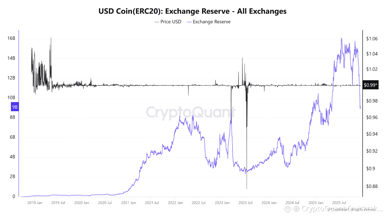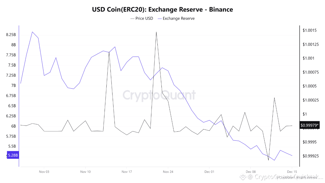 The rapid depletion of USDC exchange reserves—particularly on Binance—suggests the market is shifting from a “waiting” phase to an “active deployment” phase, with capital being put to work rather than remaining parked on exchanges.