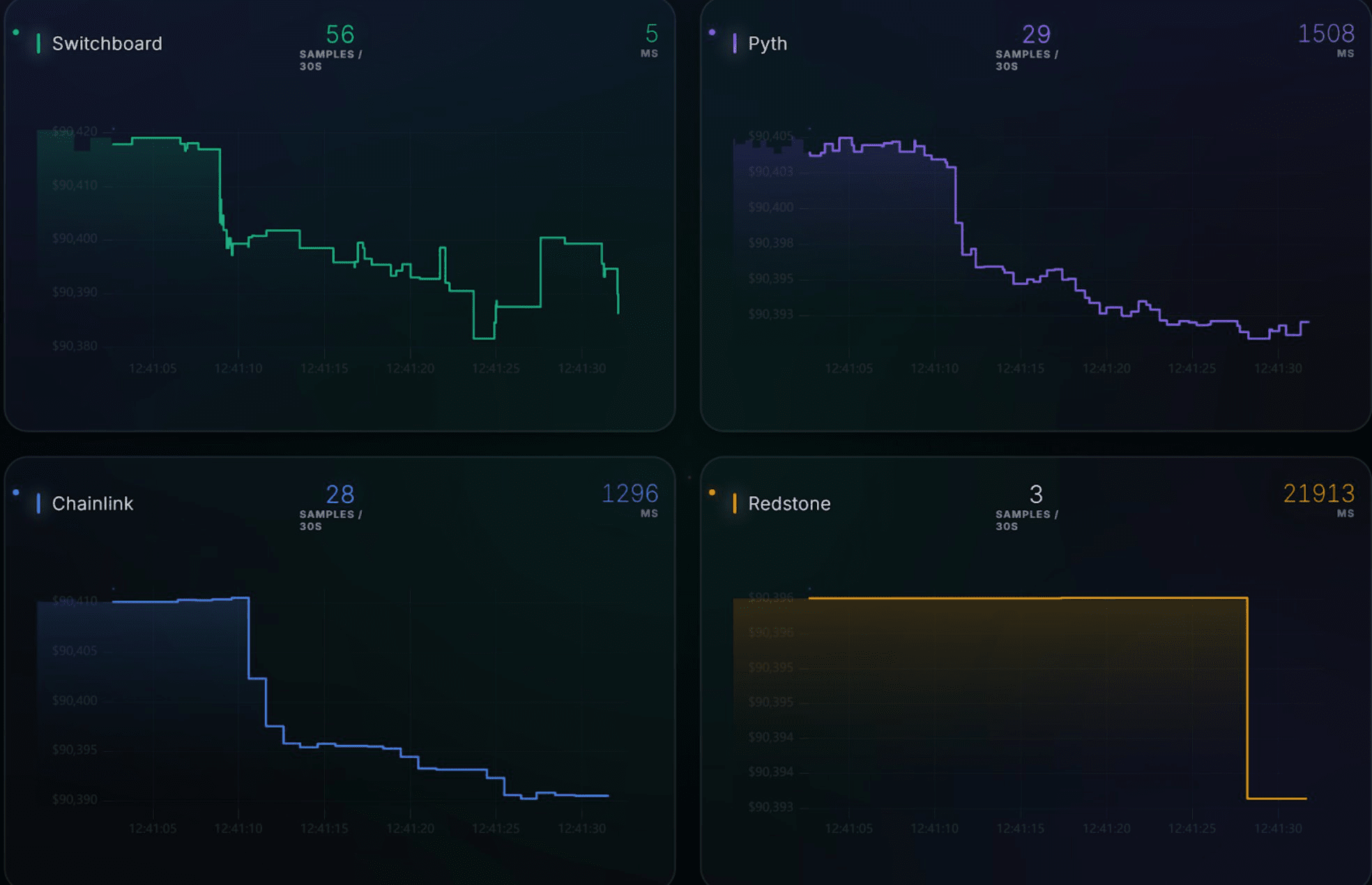 http://thepriceisright.xyz This website monitors the performance of Switchboard, Pyth, Chainlink, and Redstone in real time.