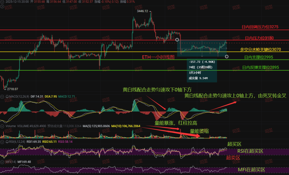 Today's 1-hour chart of ETH is simply the scene of a "wrestling match" between the bulls and bears. The price is oscillating around 3150, with resistance at 3180 above and support at 3070 below, looking like a sandwich. But looking closely at the details, this game is interesting — the MACD has just moved out of the "underwater golden cross" below the zero axis, with the yellow and white lines advancing uniformly. This structure often indicates that the bears are exhausted and the bulls are quietly gathering strength. Combining with the trading volume, the previous "huge red candlestick" was like a charge signal; although the volume has decreased now, that’s just a deep breath before the big battle.