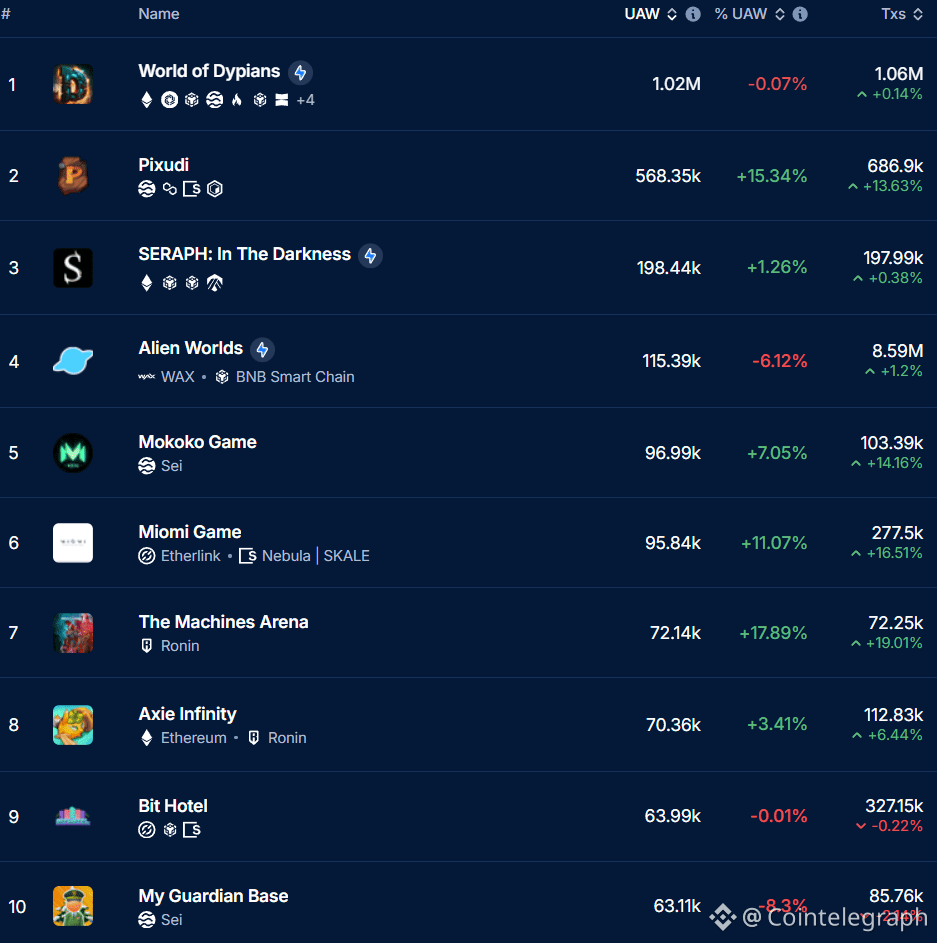 According to DappRadar, World of Dypians, which operates across multiple chains, including Ethereum and BNB Chain, leads blockchain games with more than 1 million unique active wallets interacting with the game. Treasure-collecting game Pixudi Runs, which also operates across multiple chains, such as Sei and Polygon, ranks second with nearly 570,000 active wallets.