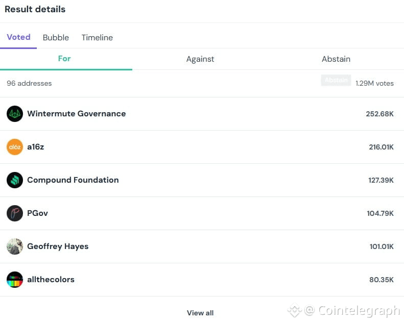 Voting power is concentrated among large tokenholders, many of whom often abstain from governance votes. Source: Tally