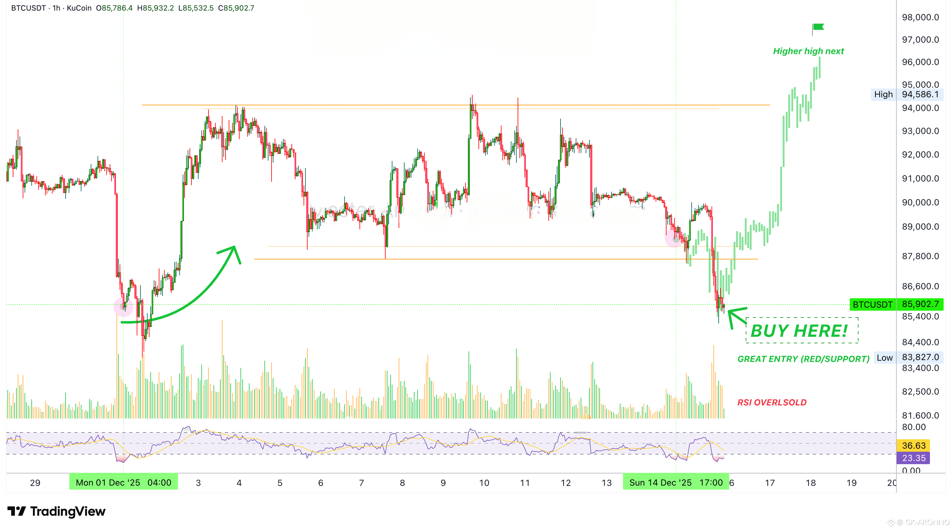 The signal coming from the RSI has been confirmed. The second drop reinforces the RSl oversold status and thus the potential for a reversal next. When the 1H RSI becomes oversold, Bitcoin turns; stops going down and starts to move up. We are witnessing the development of a higher low. All-in.