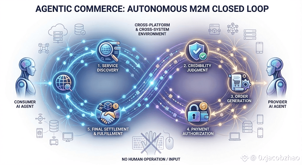 Agentic Commerce refers to a full-process commercial system where AI agents autonomously complete service discovery, credibility judgment, order generation, payment authorization, and final settlement. It no longer relies on step-by-step human operation or information input, but rather involves agents automatically collaborating, placing orders, paying, and fulfilling in a cross-platform and cross-system environment, thereby forming a commercial closed loop of autonomous execution between machines (M2M Commerce).