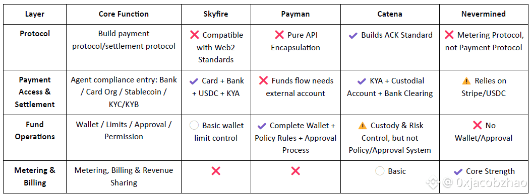 Skyfire, Payman, Catena Labs, and Nevermined belong to the business payment layer and all need to connect to banks, card organizations, PSPs, and KYC/KYB to varying degrees. But their real value is not in "accessing fiat", but in solving machine-native needs that traditional finance cannot cover—identity mapping, permission governance, programmatic risk control, and pay-per-use.