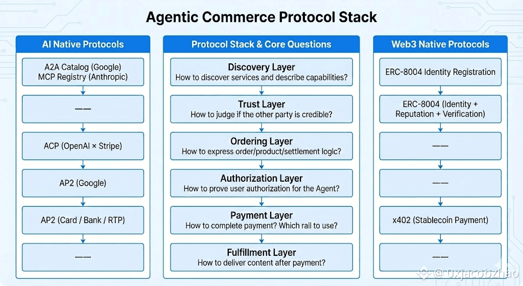 The protocol stack of Agentic Commerce consists of six layers, forming a complete machine commerce link from "capability discovery" to "payment delivery". A2A Catalog and MCP Registry are responsible for capability discovery, ERC-8004 provides on-chain verifiable identity and reputation; ACP and AP2 undertake structured ordering and authorization instructions respectively; the payment layer is composed of traditional fiat rails (AP2) and stablecoin rails (x402) in parallel; the delivery layer currently has no unified standard.