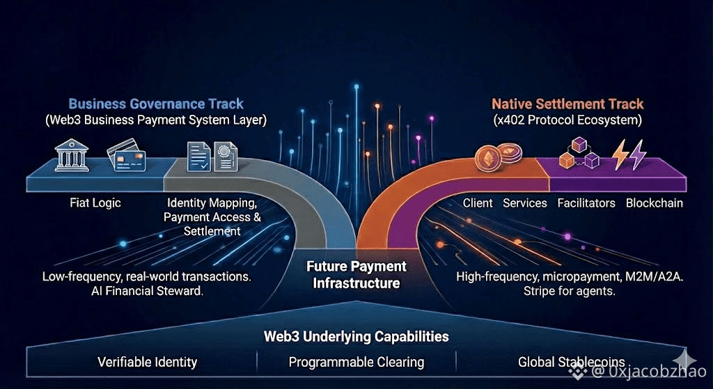 Along this evolutionary path, future payment infrastructure will diverge into two parallel tracks: one is the Business Governance Track based on traditional fiat logic, and the other is the Native Settlement Track based on the x402 protocol. The value capture logic between the two is different.