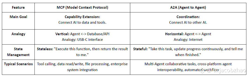 A2A solves "How Agents collaborate with other Agents"—establishing native communication standards for cross-vendor, cross-framework agents, supporting multi-turn dialogue, task decomposition, state management, and long-lifecycle execution. It is the basic interoperability layer between agents.