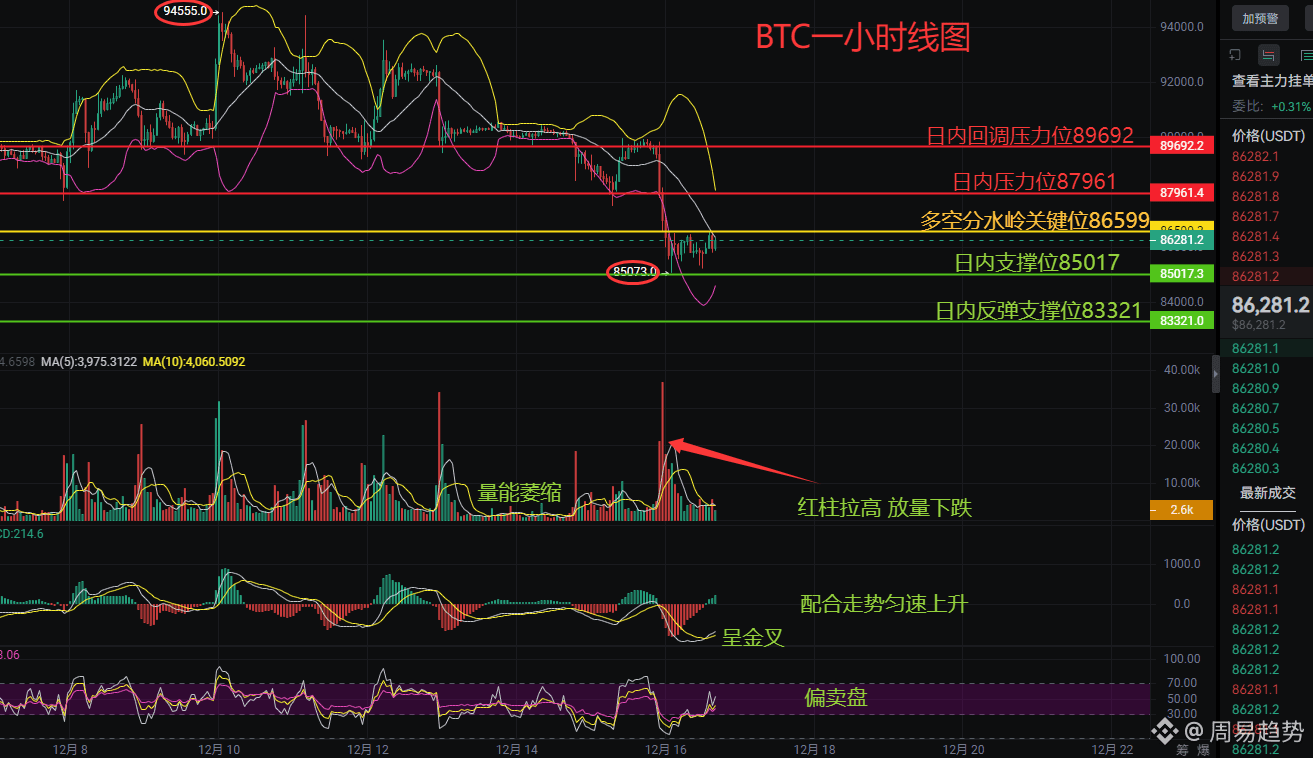 暴跌≠结束,而是主力洗牌。当前在86000附近多空激烈交战,如果今晚站稳86599上方,会先冲87961测试压力;如果跌破85017,大概率去83321找支撑。但记住——MACD金叉 + 放量下跌,往往伴随反弹!