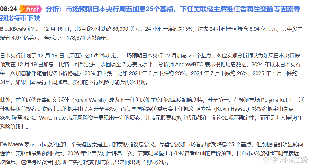 日本央行周五可能加息25个基点,历史上每次它加息,比特币都跌超20%!再加上美联储下任主席人选突然生变,宏观不确定性直接砸盘。但注意——市场已提前消化利空,Wintermute等机构却说:这不像持续避险,更像是“假摔”。