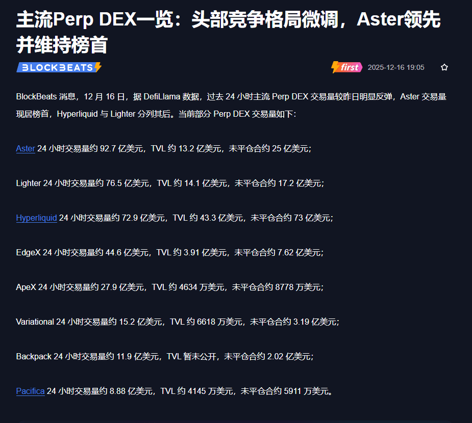 Brothers, have you come across this news? The black background with white text is quite awakening. The 24-hour data shows changes again; Aster has taken the top seat with a trading volume of 9.27 billion, temporarily pushing Hyperliquid and Lighter behind. In my years in the circle, I've seen this kind of scene many times; today you lead, tomorrow he exerts his strength; this is the norm.