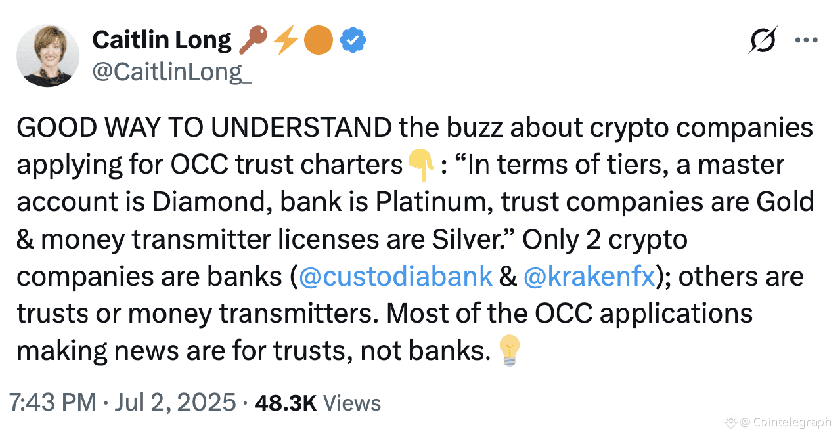 “In terms of tiers, a master account is Diamond, bank is Platinum, trust companies are Gold and money transmitter licenses are Silver,” Custodia Bank founder and CEO Long said in an X post in July, adding that Custodia and Kraken are the “only two crypto companies” that are banks.