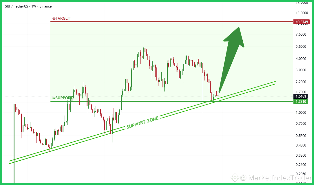 The SUI/USDT Weekly chart is flashing a strong reversal signal. After a steep drawdown, the price successfully tested and bounced precisely off the confluence of two major support zones: the horizontal support at $1.33 and the robust, long-term upward diagonal trendline. Holding this critical $1.33 - $1.50 region is paramount. If momentum picks up from here, the immediate resistance is $2.20, with the ultimate macro target set aggressively at $10.37.