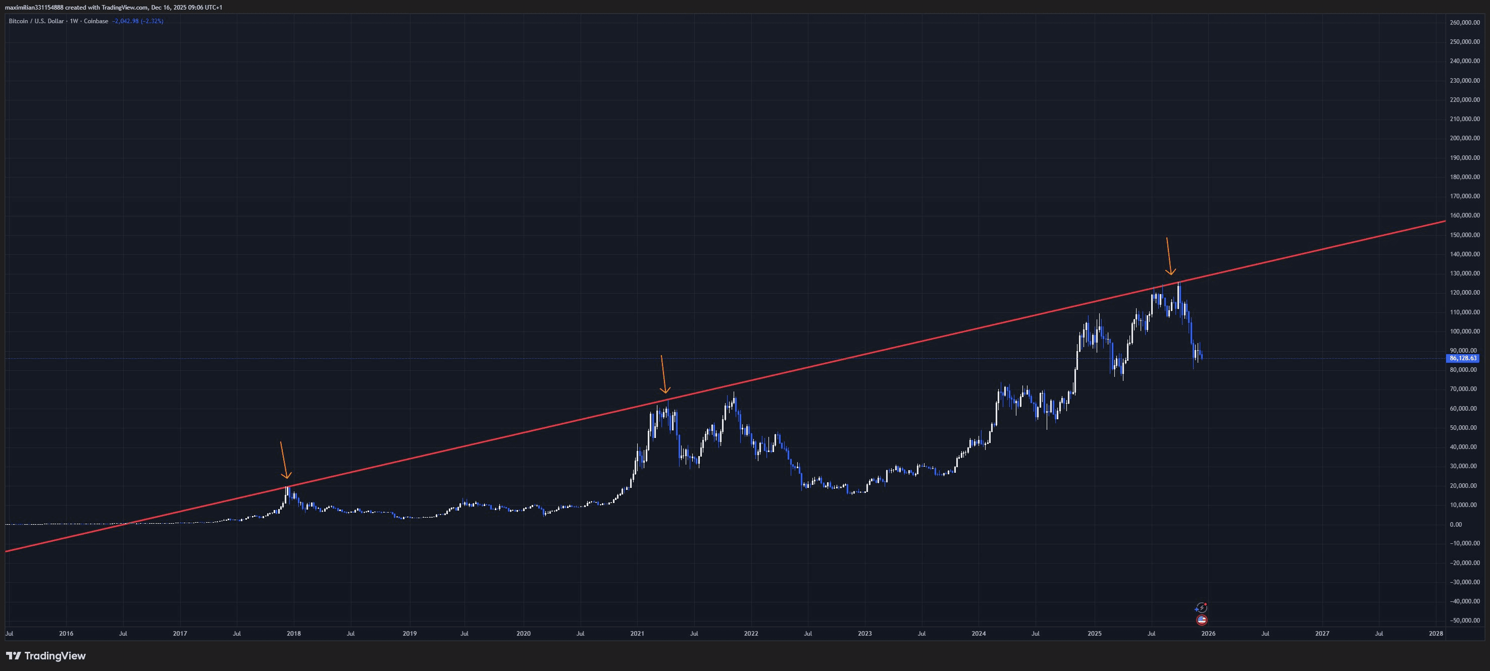 It is truly rare for me to see a chart that clearly illustrates a trend like this. It is the long-term resistance trendline of Bitcoin, spanning multiple cycles. Each time $BTC touches this line in the past, it has created a peak and then been pushed down. Based on historical data, it is indeed not off by a bit.