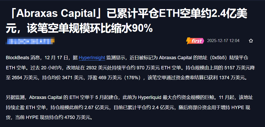 A short position of 240 million USD was closed by 90% within 20 hours, and the short-selling giant Abraxas Capital is quietly retreating from the ETH market, while the price remains deadlocked between 2880 and 3000 USD.