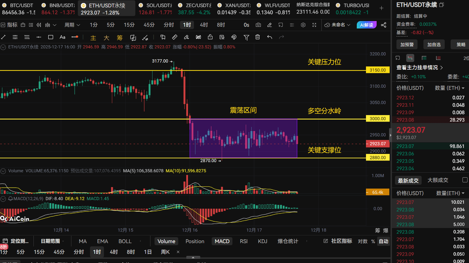 The price is still oscillating between the support at $2880 and the resistance at $3000, with alarms flashing on the exchange's data screen for imminent long and short liquidations.