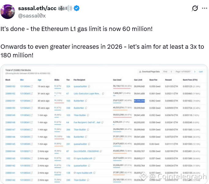 Members of the Ethereum developer and research community have expressed a common goal to raise the network’s gas limit to 180 million by the end of 2026.
