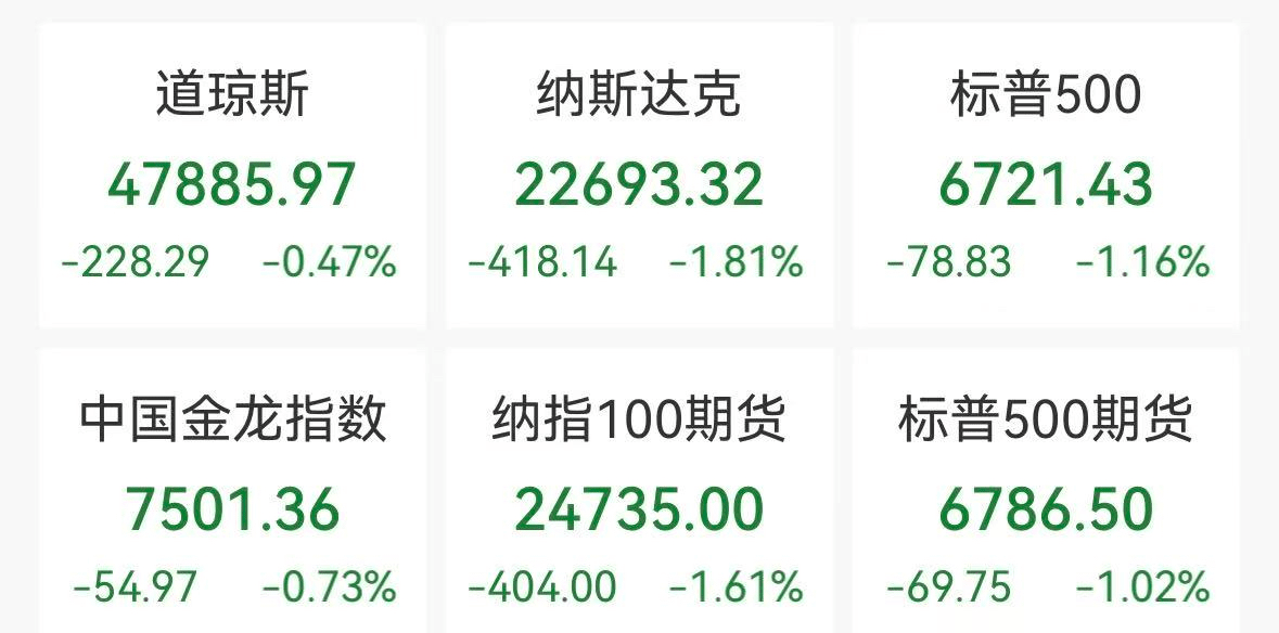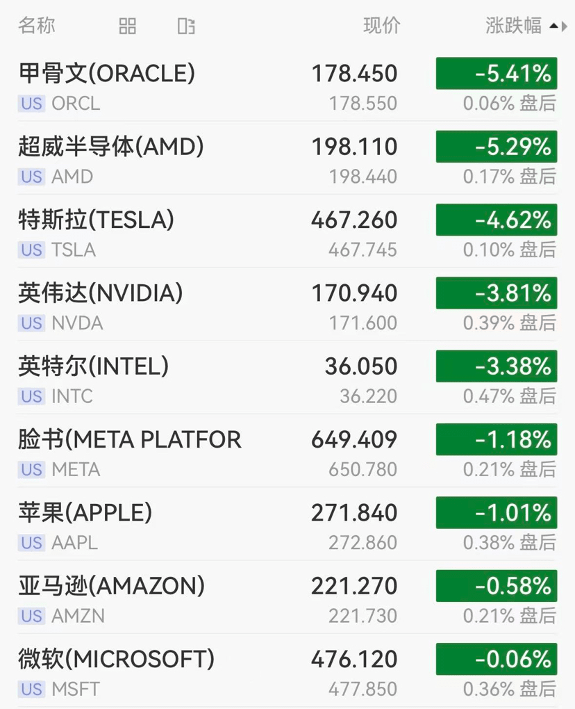 Large technology stocks collectively fell, with popular stocks like Oracle dropping over 5%, Tesla falling over 4%, and Nvidia dropping nearly 4%. The market value evaporated by $164.8 billion (approximately 116.08 billion yuan) overnight.