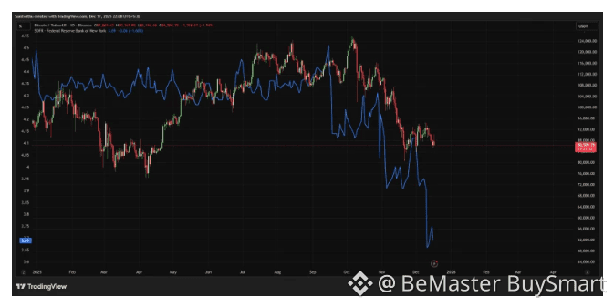 $BTC Bitcoin keeps dropping even though interest rates are coming down. The reason is that two stronger forces are at work - traders are borrowing less and companies are trimming their balance sheets. Those two pressures outweigh the usual lift that assets receive when money becomes cheaper.