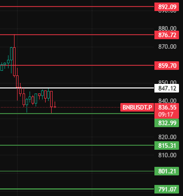 BNB pay attention to the position 847 today. Only if it stays above this position for 1-2 hours can it start to rebound. Continue to pay attention to the resistance levels nearby 859-876-892!