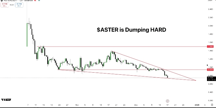 $ASTER the price is collapsing and the major fundamental news, even CZ buying and trading, have not managed to push it up. Since the peaks after the introduction, above $2, the price has compressed into a clear downward structure and is now trading around the $0.74 to $0.75 region, representing more than a 65% drop from the peaks and about 25% below the $1 level where even strategic buyers were involved.