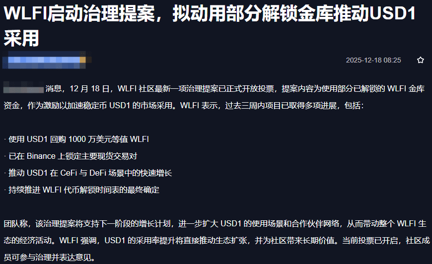 This morning's governance proposal mentioned using treasury funds to push USD1, which seems like good news, right? But I need to douse you with some cold water: voting has just started, and the money hasn't actually moved yet. Such advance good news is too common in the crypto world, often used to stabilize the market and create optimistic sentiment. The key point is: the team specifically emphasized that they have repurchased 10 million WLFI and locked the trading pair on Binance, these two things seem more like a hedge against the possible unlocking or selling pressure that may come.