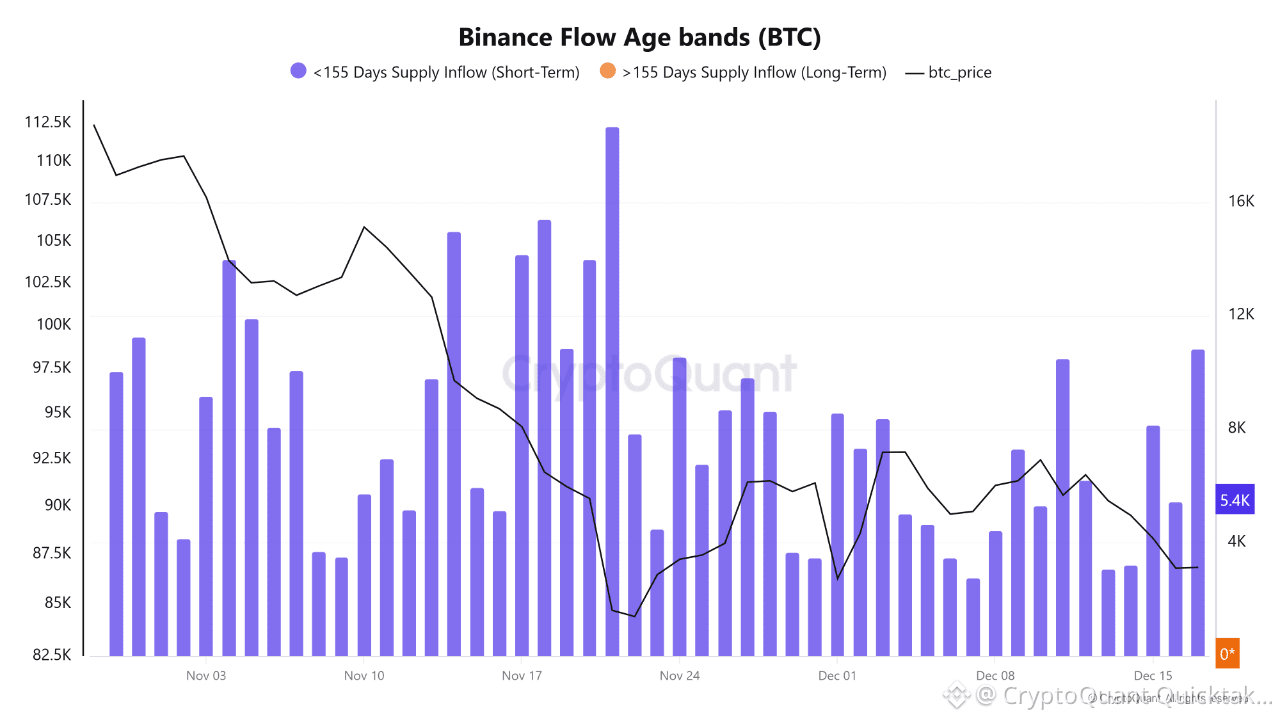 Yesterday’s Bitcoin inflows into Binance clarify an important market question: who actually sold the dip? While exchange inflows increased during the price pullback, UTXO age data shows the pressure did not come from long-term holders. Coins older than 155 days remained largely inactive, confirming that conviction holders stayed calm. The selling was dominated by short-term holders, meaning this move was driven by recent buyers reacting tactically, not by long-term distribution.