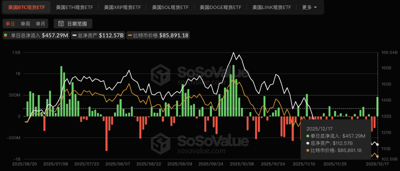 ETF data also shows that BTC saw an inflow of $457 million on December 17, ending two consecutive days of net outflows.