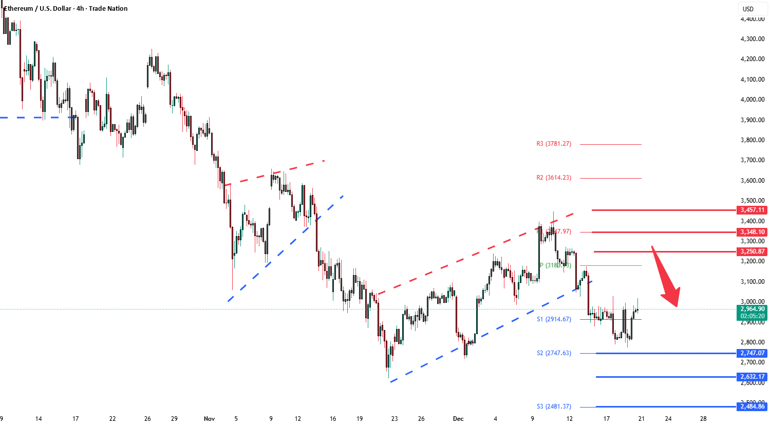 ETHUSD remains under bearish pressure, with the 3,250 level acting as a key inflection point. As long as price remains below this level, the bias favours further downside. Traders should watch for price confirmation around that level to assess the next move.