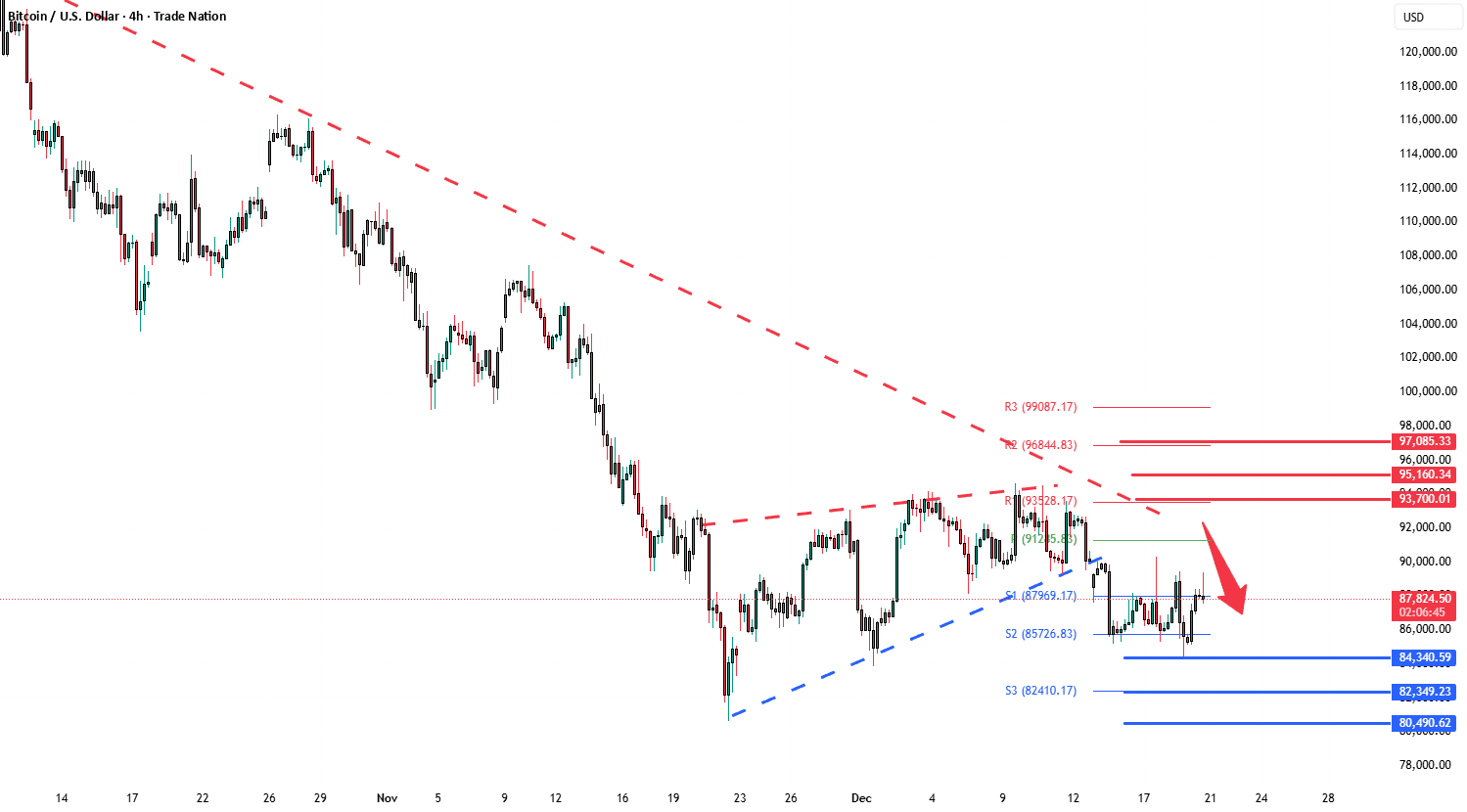 A confirmed breakout and daily close above 93,700 would invalidate the bearish setup.