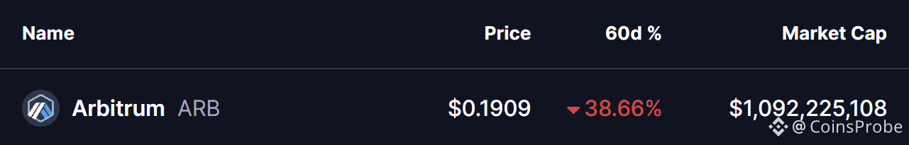 The broader cryptocurrency market has remained locked in choppy price action over the past several weeks, a phase that began after the sharp sell-off on October 10. That correction pulled Ethereum (ETH) lower by nearly 23% over the last 60 days, keeping consistent downside pressure on major altcoins. Arbitrum (ARB) has been caught in the same wave of weakness, struggling to regain bullish momentum.