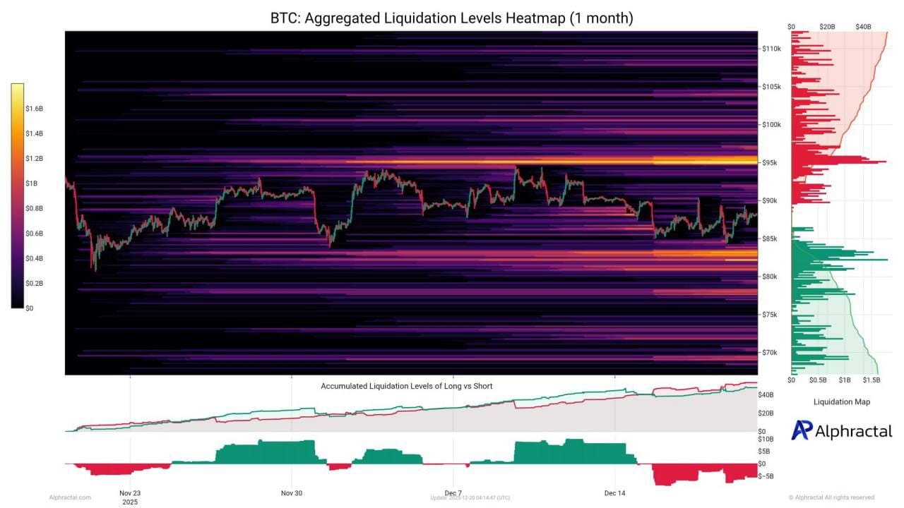 According to Alphractal, Bitcoin is currently squeezed between two key liquidation zones: