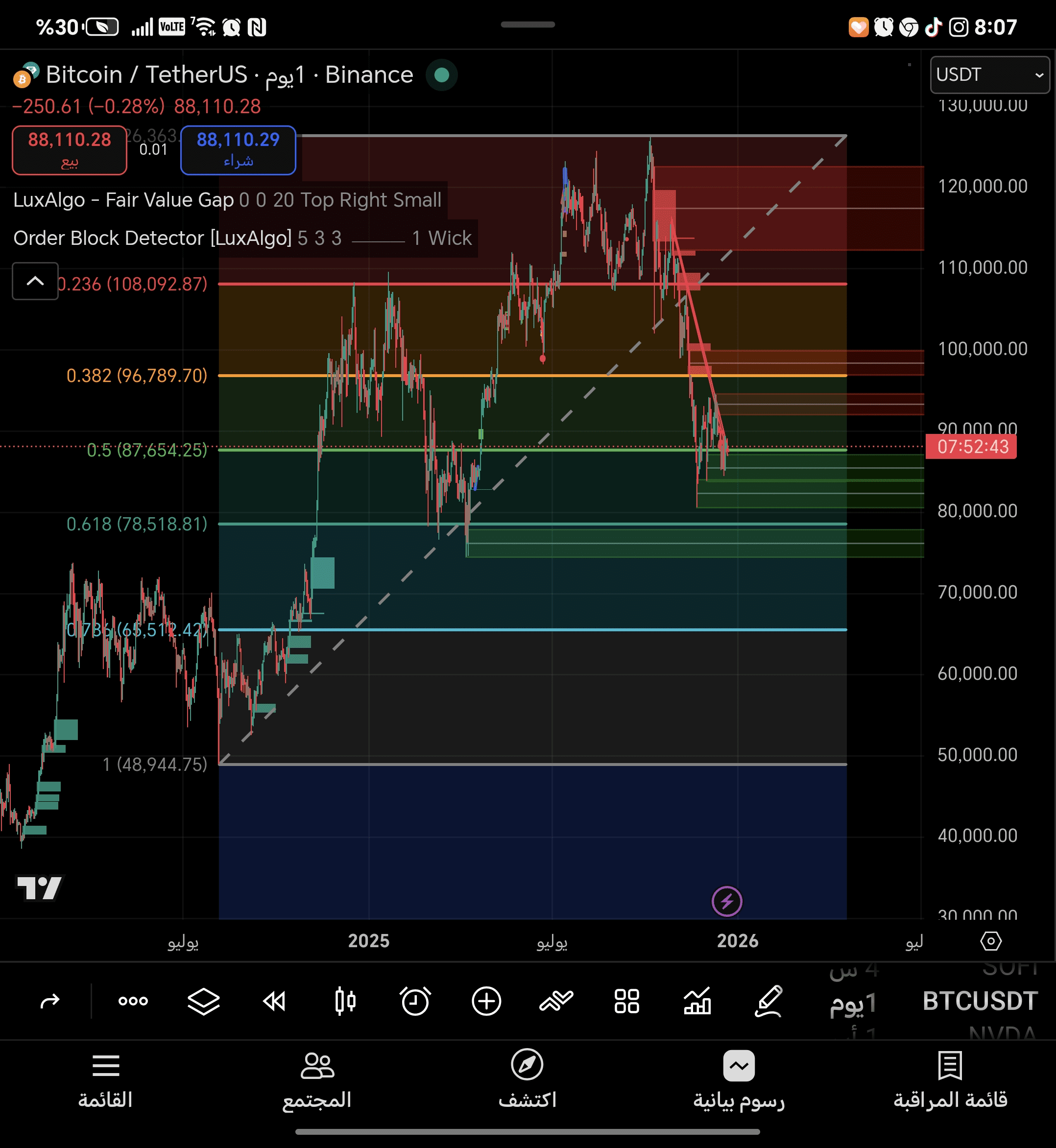 The price is trading around the 0.5 level = $87,654 — a critical Pivot area.