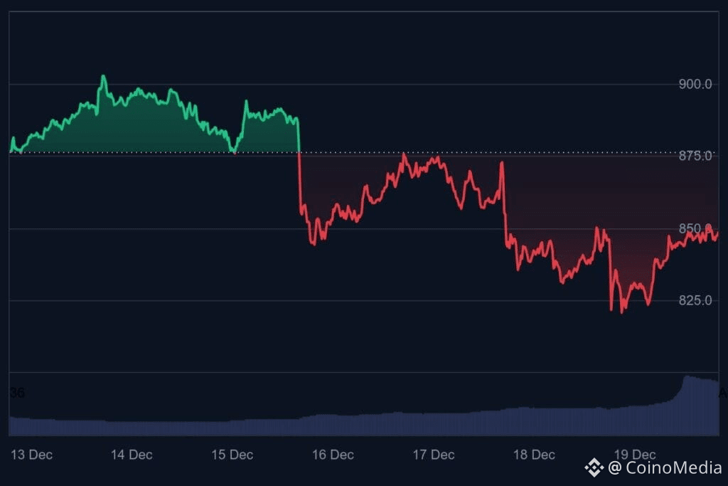 BNB’s price has taken a modest hit this week amid broader market weakness. After starting the week on December 13 near $877, the token slid to roughly $847 by December 19, reflecting a roughly 4% decline over six days as risk assets falter and traders reduce exposure to larger cap alts. This softness in BNB price action has tempered short-term optimism in the BNB price prediction, even as some analysts still model mid-term upside potential.