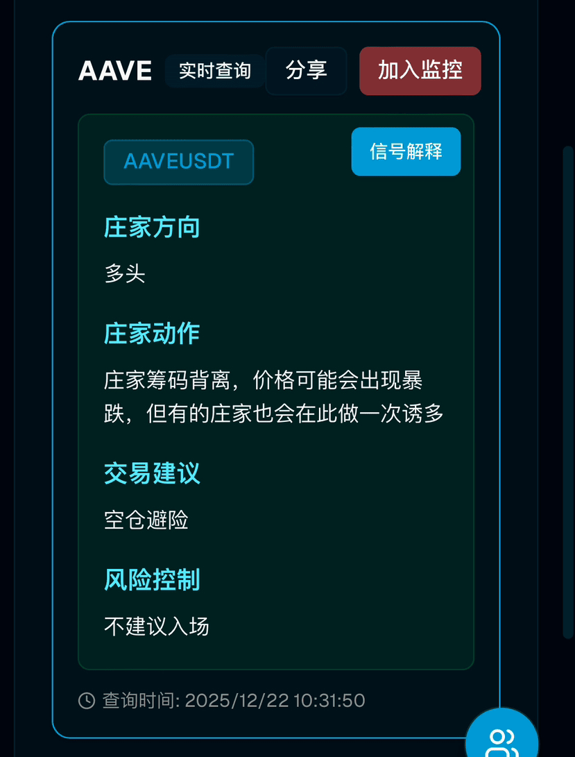The current intraday monitoring signal for AAVE is highly bearish and the risk is extremely high. The direction indicated by the big players is superficially bullish, but the system clearly warns of a divergence in chips, and the price may experience a crash. The trading advice is to 'go flat to avoid risks,' and risk control clearly states that entry is not recommended. Any operation should be approached with high caution.