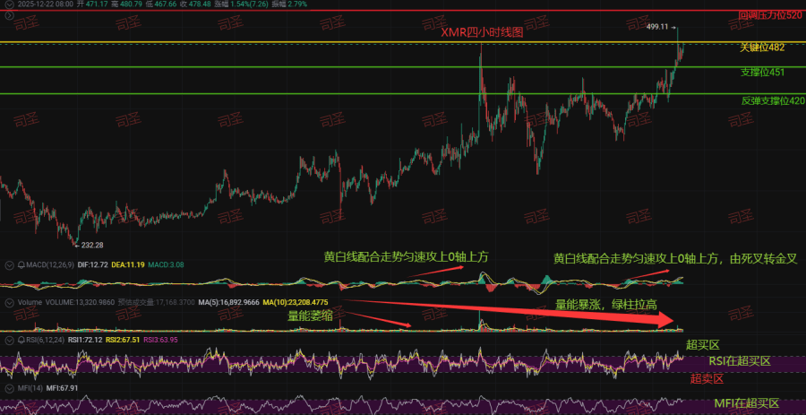 Family, here’s the four-hour chart of XMR. I know you’re all anxious: it has risen, but can we still chase it at this position? Should we go straight to 520, or turn around and rush towards 451 or even 420? Don't panic, let me break it down for you in plain language, while also revealing some life-saving techniques used by seasoned players.