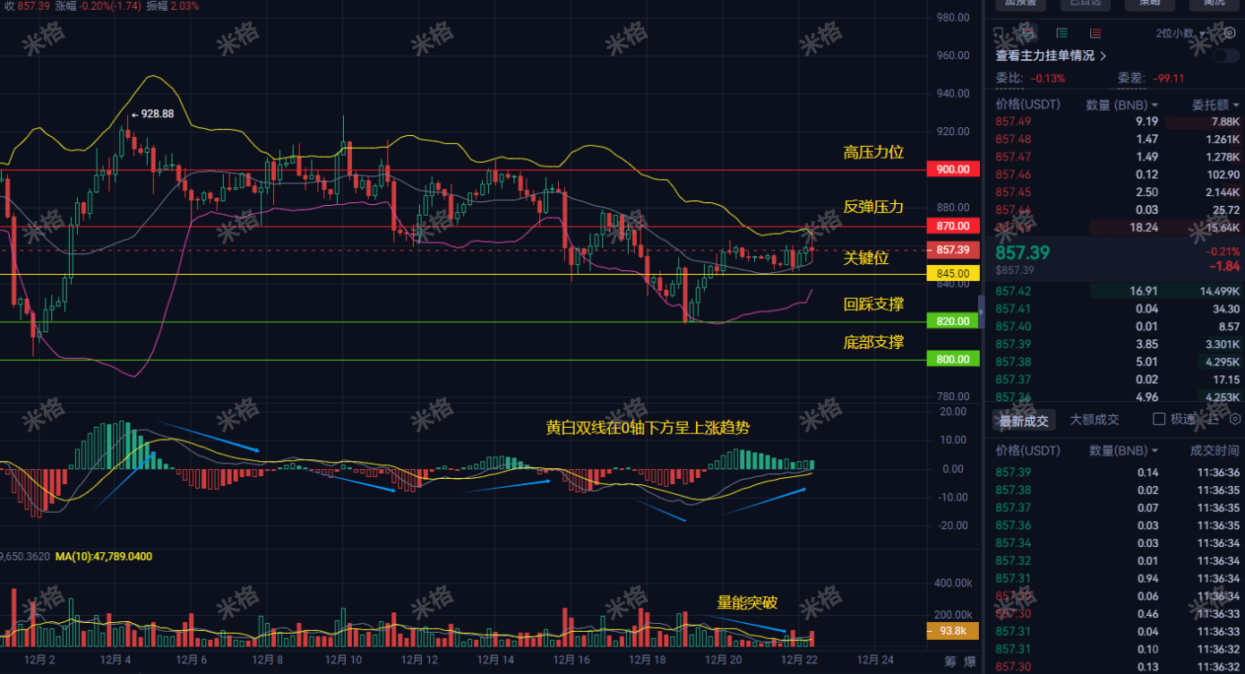 Mig's personal opinion: Although BNB has been flat over the weekend, the upward pressure is heavy, it's uncertain whether it can surpass 870, and 900 requires substantial capital and emotional support. What about going down? If market sentiment weakens, the possibility of testing 820 or even probing 800 is greater than the potential for a new high.