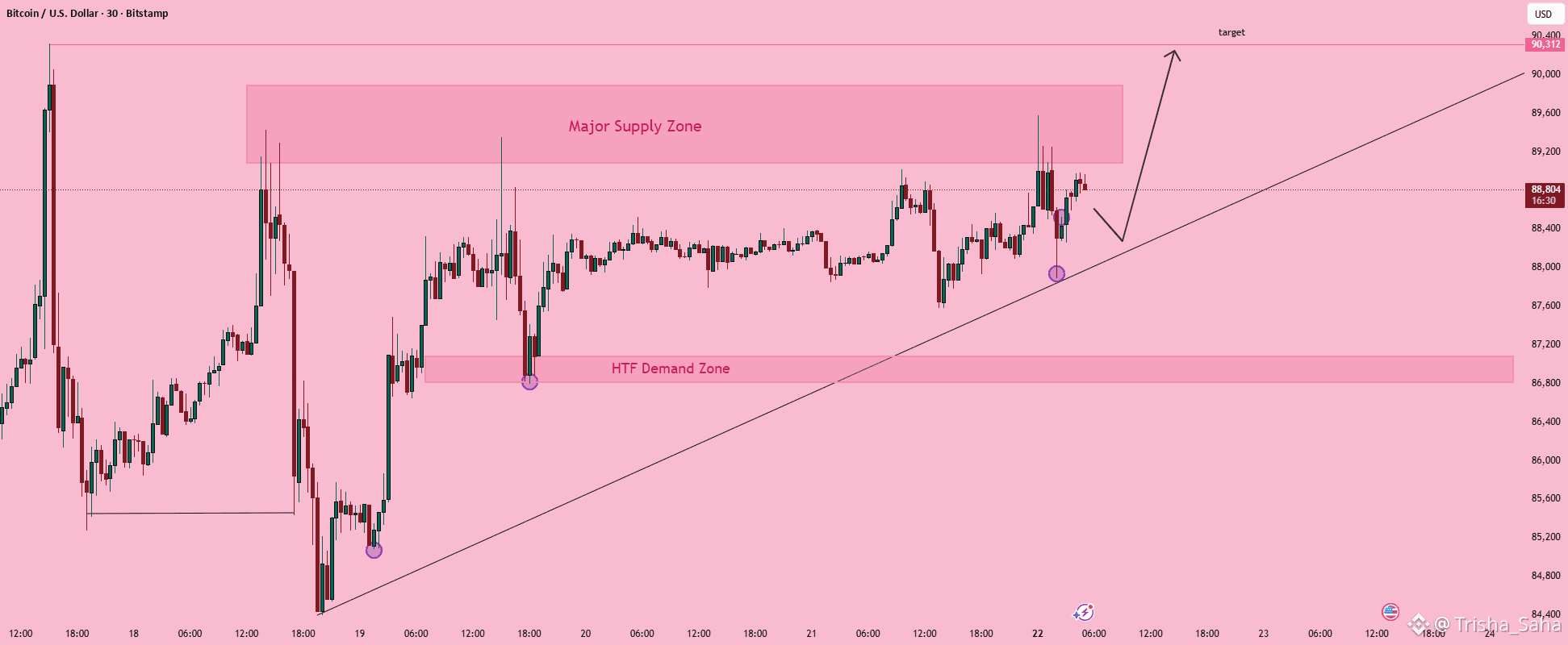 After a strong impulsive rally from the HTF demand zone (~86.8K), BTC transitioned into consolidation while respecting trend support. Multiple reactions from the trendline (purple circles) confirm buyer presence. However, upside progress is slowing as price meets heavy sell-side liquidity and supply overhead, increasing the probability of either a breakout or a rejection.