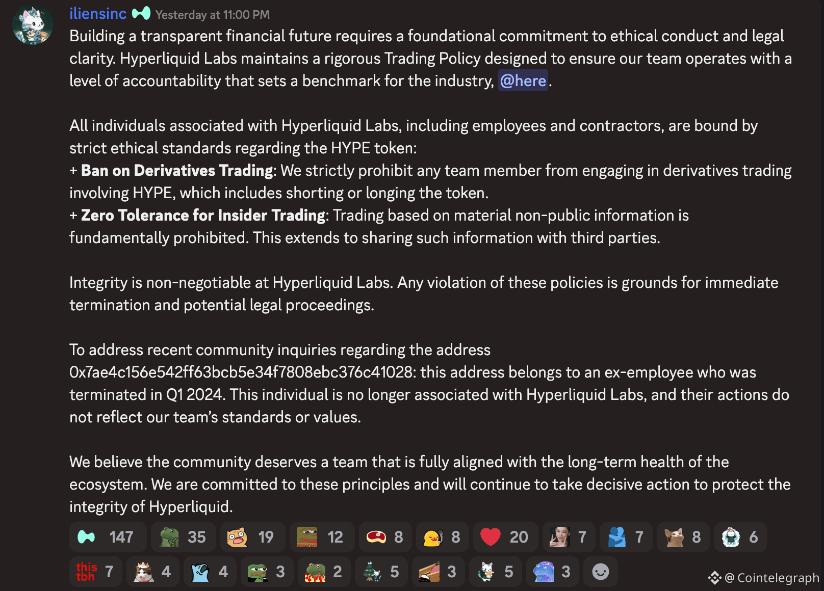 In the Discord post, Iliensinc said that Hyperliquid Labs maintains a strict trading policy designed to ensure that its team operates with a “level of accountability that sets a benchmark for the industry.”