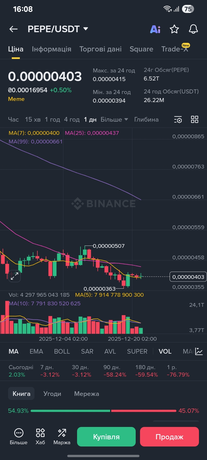 Price and trend: Currently, PEPE is trading around $0.00000403. Over the past months, the coin has shown a significant decline (over -76% from its historical maximum in 2024).