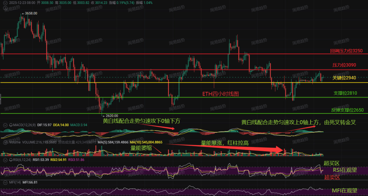 From this 4-hour chart, ETH now looks like a 'woken lion': the MACD yellow and white lines have already crossed, steadily climbing above the 0 axis, which is a sign of a short-term strengthening! But don't rush in, there are two big mountains above: 3090 is the daily resistance, and 3250 is the strong rebound resistance. There are also two lines of defense below: 2940 is a key short-term level, 2810 is support, and if it drops significantly, we still need to watch 2650.