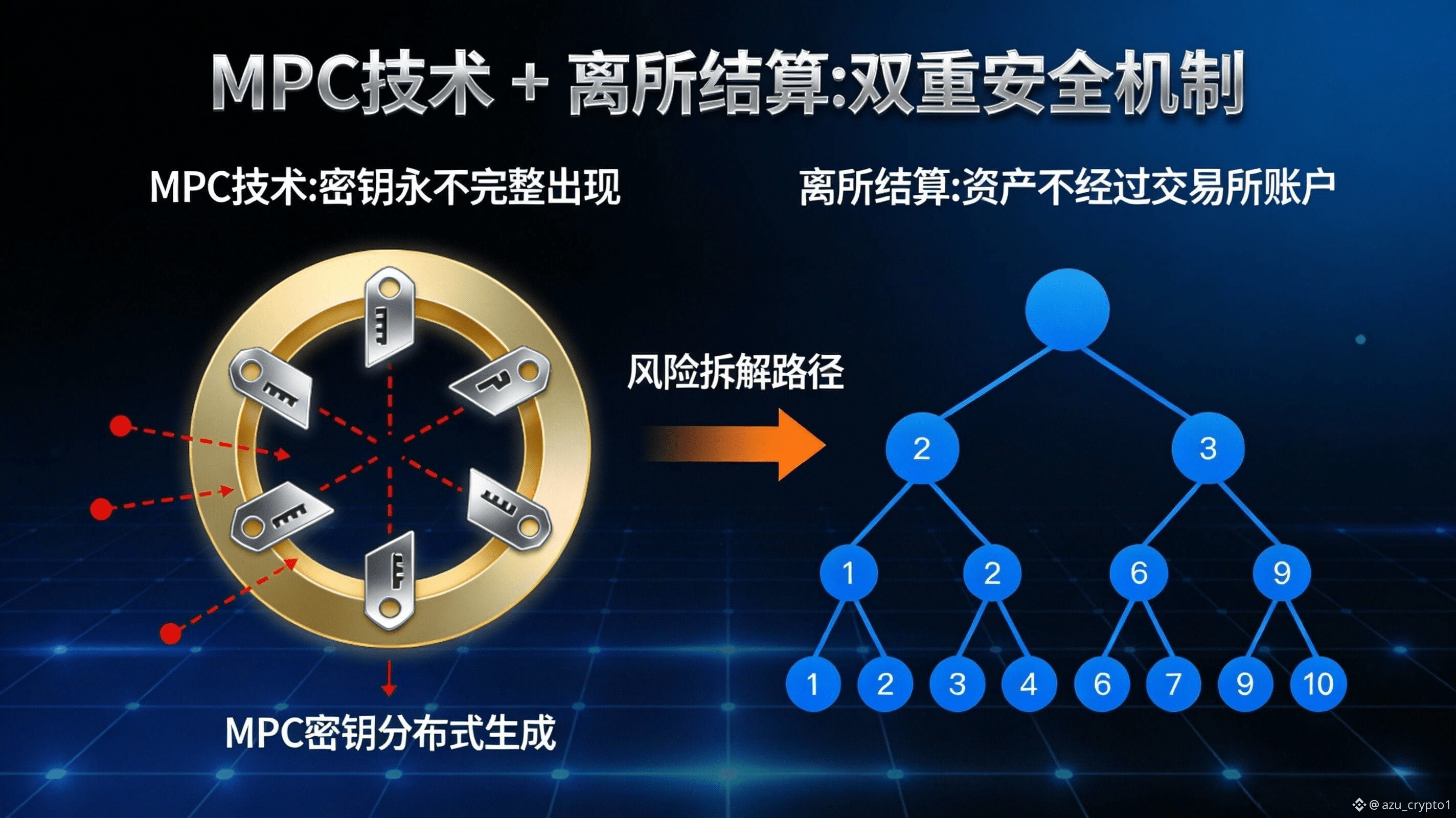 为什么要把交易所余额压到最小?因为 CeDeFi 的尴尬点就在这:收益机会往往在交易所和链上同时出现,但交易所本身又是最大的对手方黑箱。Falcon 的叙事并不是“我们不碰交易所”,而是把交易所当成“执行场”,而不是“保管场”。你在交易所里暴露的风险,理想状态下应该只等于“执行所需的最小资金”,而不是把整个储备押在某一家平台的信用上。 这就解释了为什么它要强调 MPC + 离所结算:MPC 解决的是密钥与操作权限的单点风险,离所结算解决的是“资产长期趴在交易所”带来的集中对手方风险。