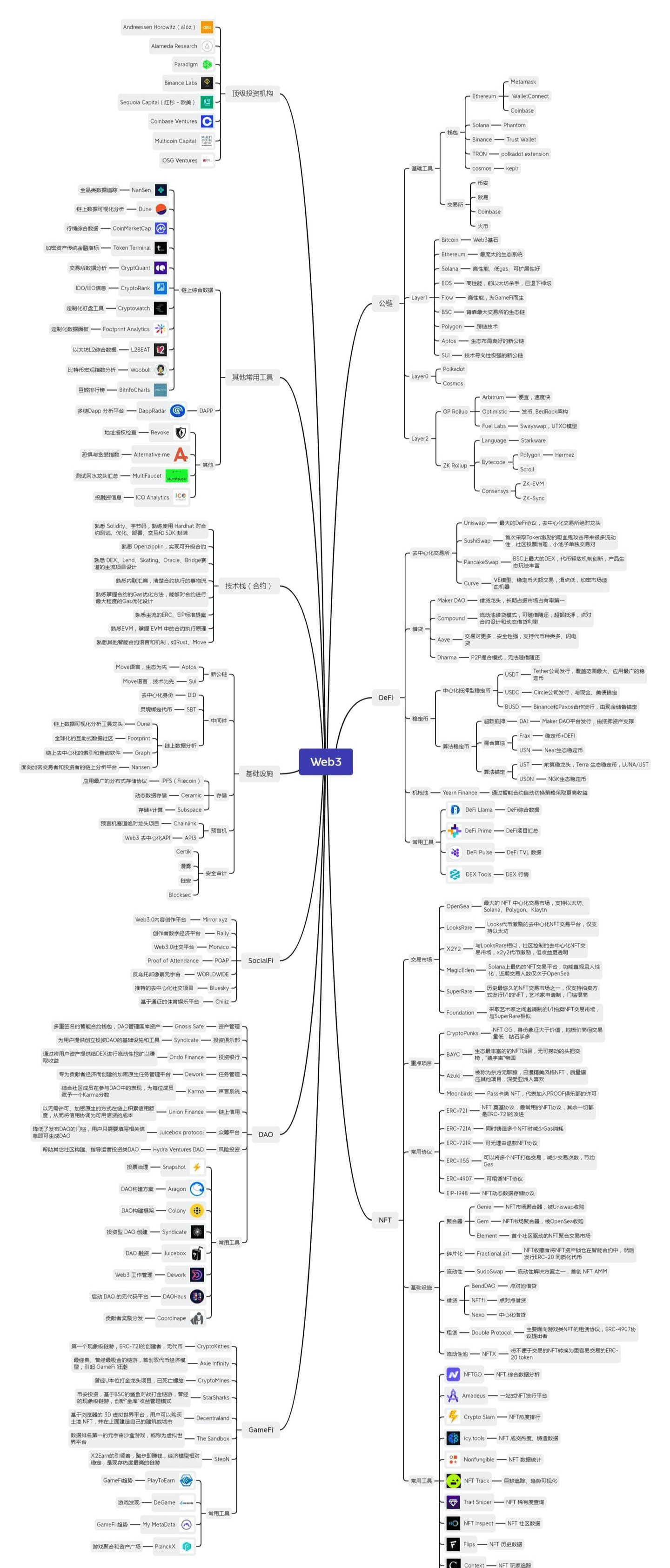To facilitate everyone's learning, I have categorized the leading projects, commonly used tools, top investment institutions, development technology stacks, etc., of Web3 into the figure below, and summarized each project in one sentence. If you thoroughly study all the projects and tools in this figure, you will have definitely surpassed over 90% of people in Web3. While learning, you will discover your interests, find your own track, and begin to delve deeper: