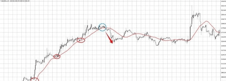 When the candlestick actually breaks below the moving average, it is usually accompanied by a significant downward trend.