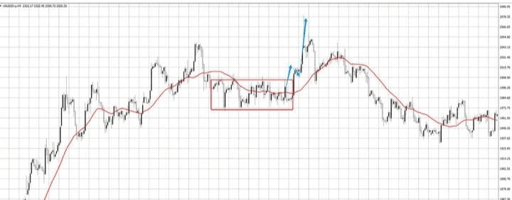 In addition to continuously running above or below the moving average, if the candlestick and moving average repeatedly intertwine, it usually indicates a consolidation market. For example, this segment is a clear box. When the market breaks, it is usually accompanied by large bullish and bearish candlesticks, followed by a slight pullback to confirm support, then further rebound.
