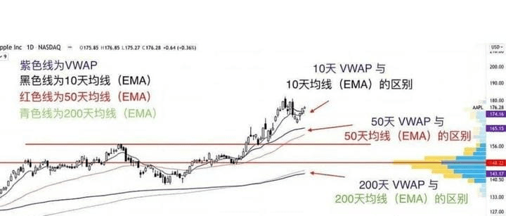 To provide a direct comparison, in the figure below, the 50-day VWAP is clearly higher than the regular 50-day moving average, so during actual pullbacks, you will find prices closer to the VWAP rather than the EMA price. If you hope to buy in by confirming support through pullbacks, you may never be able to buy at that price.