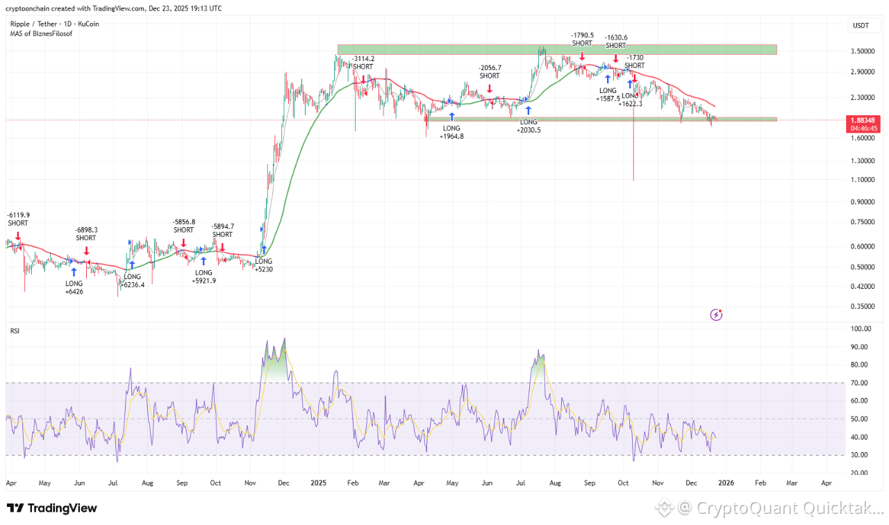 Demand Zone: XRP is currently testing the major support range between $1.80 and $1.90 (green box). Holding this level is essential to preserve the broader bullish market structure.