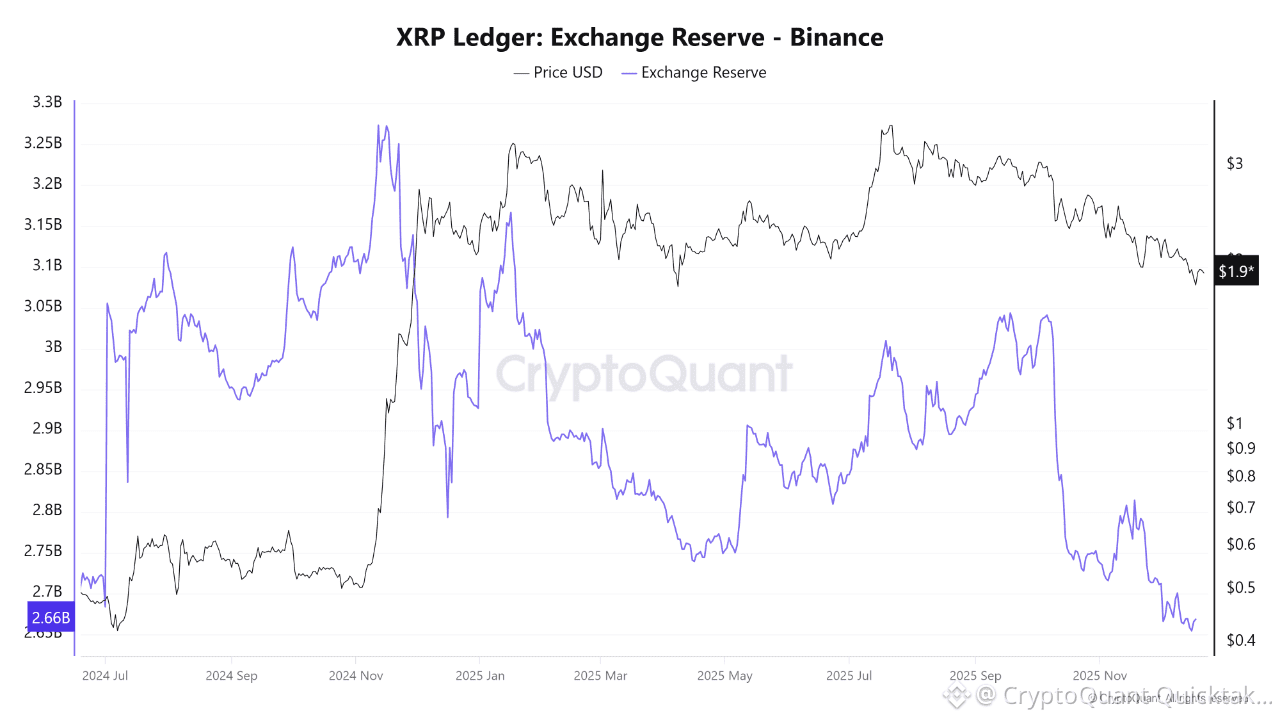 According to the XRP Ledger: Exchange Reserve chart, XRP holdings on Binance have experienced a steep decline, falling to 2.66 billion XRP. This marks the lowest exchange balance recorded since July 2024.