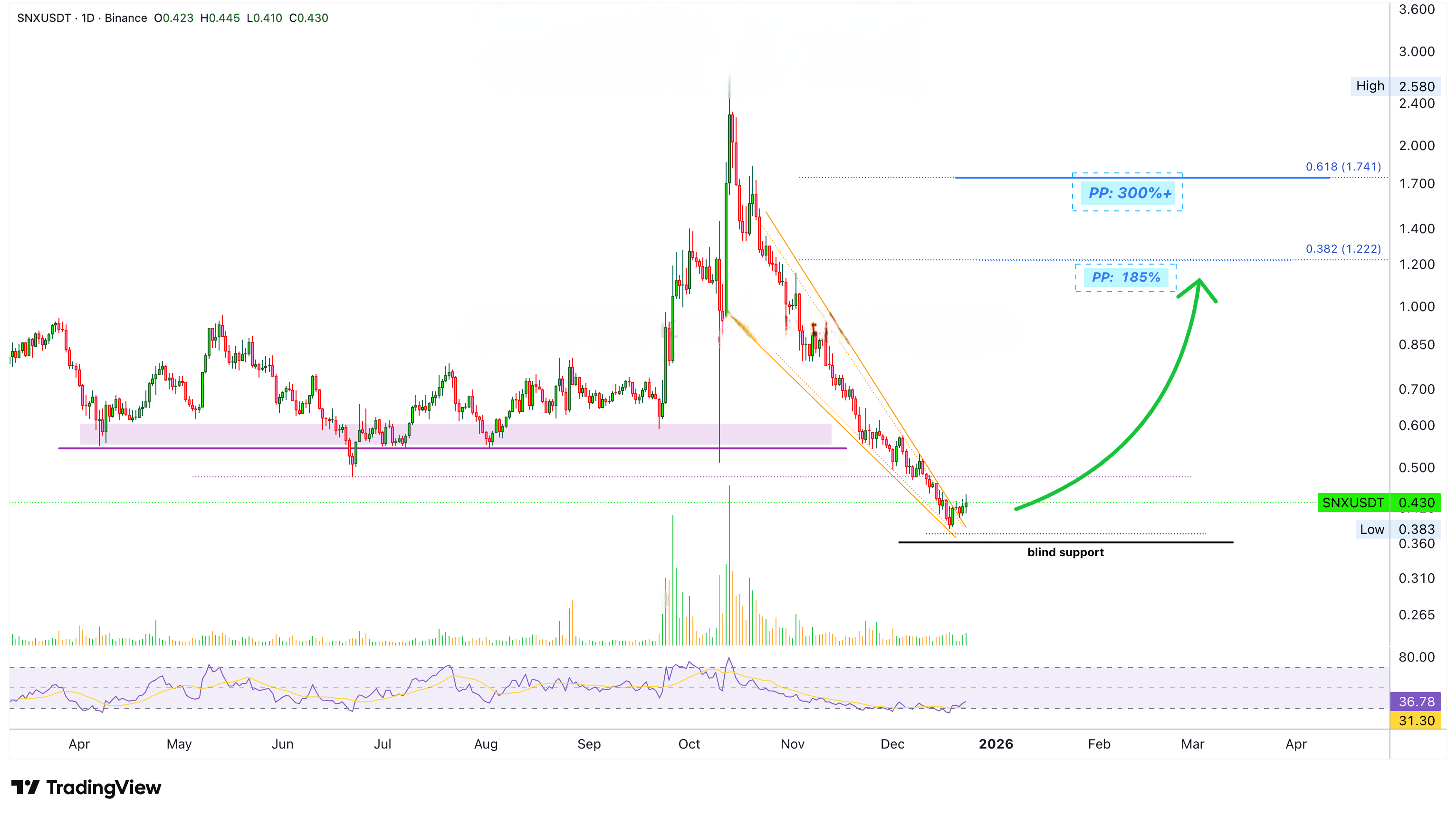 Returning only to the baseline can result in significant gains. An upward wave here could easily produce some 150% to 300% within weeks or days, once the upward movement starts.